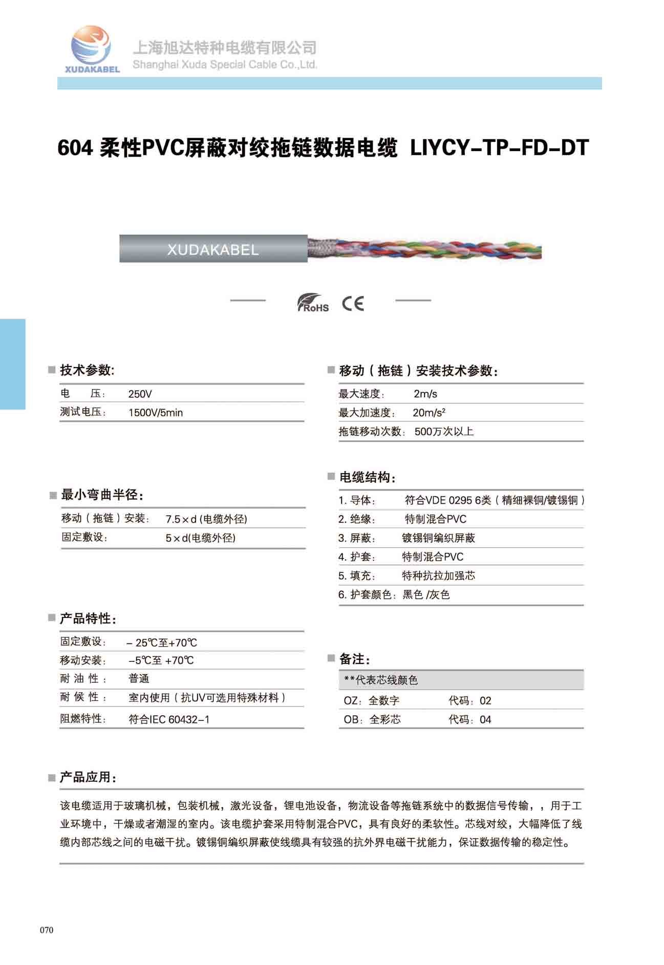 產品簡介:該電纜適用于玻璃機械,包裝機械,激光設備,鋰電池設備,物流設備等拖鏈系統中的數據信號傳輸,,用于工業環境中,干燥或者潮濕的室內。該電纜護套采用特制混合PVC,具有良好的柔軟性。芯線對絞,大幅降低了線纜內部芯線之間的電磁干擾。鍍錫銅編織屏蔽使線纜具有較強的抗外界電磁干擾能力,保證數據傳輸的穩定性