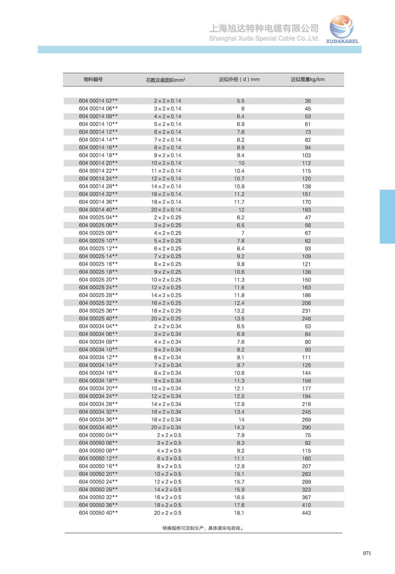 物料編號 芯線及截面積mm2 最大外徑(d)mm 電纜近似重量Kg/km