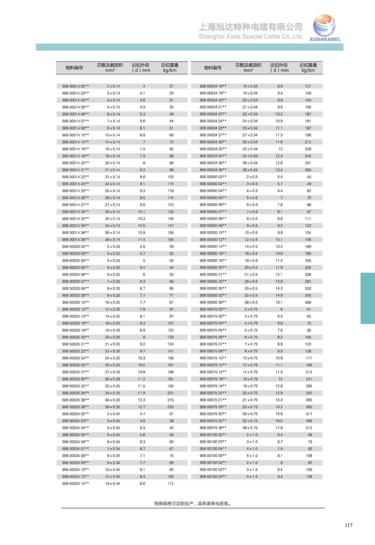 物料編號 芯線及截面積mm2 最大外徑(d)mm 電纜近似重量Kg/km