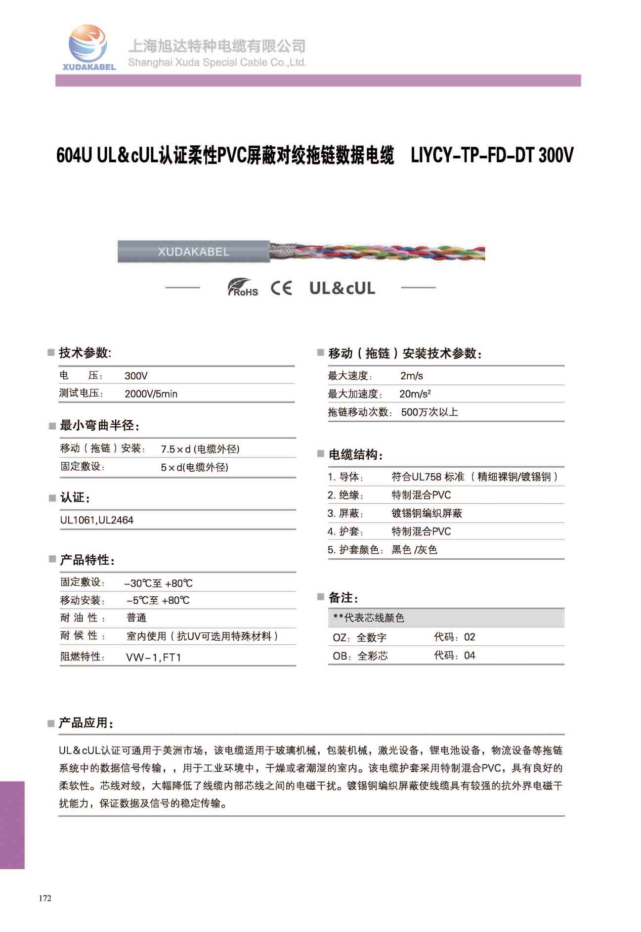 604U UL&cUL認證柔性PVC屏蔽對絞拖鏈數據電纜 LIYCY-TP-FD-DT 300V