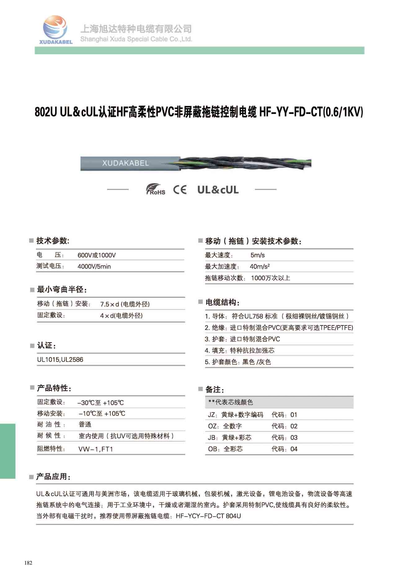 產(chǎn)品簡介:UL&CUL認證可通用與美洲市場,該電纜適用于玻璃機械,包裝機械,激光設(shè)備,鋰電池設(shè)備,物流設(shè)備等高速拖鏈系統(tǒng)中的電氣連接,用于工業(yè)環(huán)境中,干燥或者潮濕的室內(nèi)。護套采用特制PVC,使線纜具有良好的柔軟性,當外部有電磁干擾時,推薦使用帶屏蔽拖鏈電纜HF-YCY-FD-CT 804U